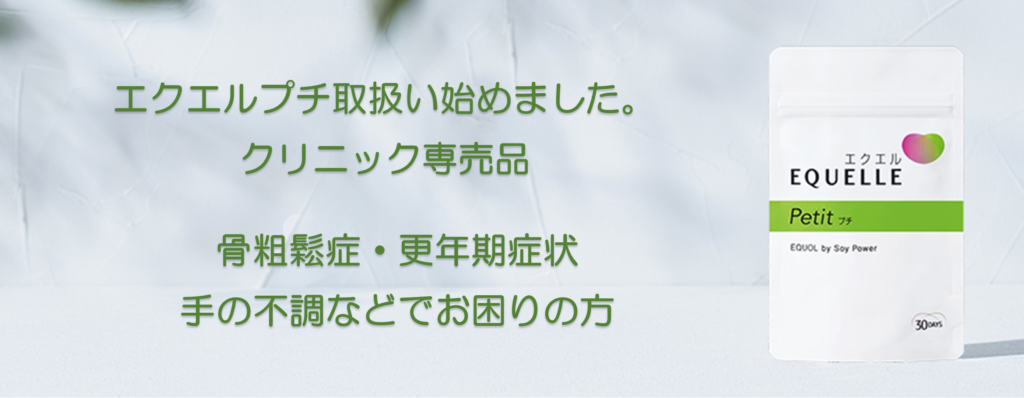 「女性の健康と美容をサポートする クリニック専売サプリメント『エクエルプチ』。大豆由来成分エクオールを1日2粒で効率的に摂取でき、小粒で飲みやすく続けやすい設計です。更年期症状の緩和、骨密度の維持、美肌ケアなど、毎日の健康習慣にぜひお役立てください。」